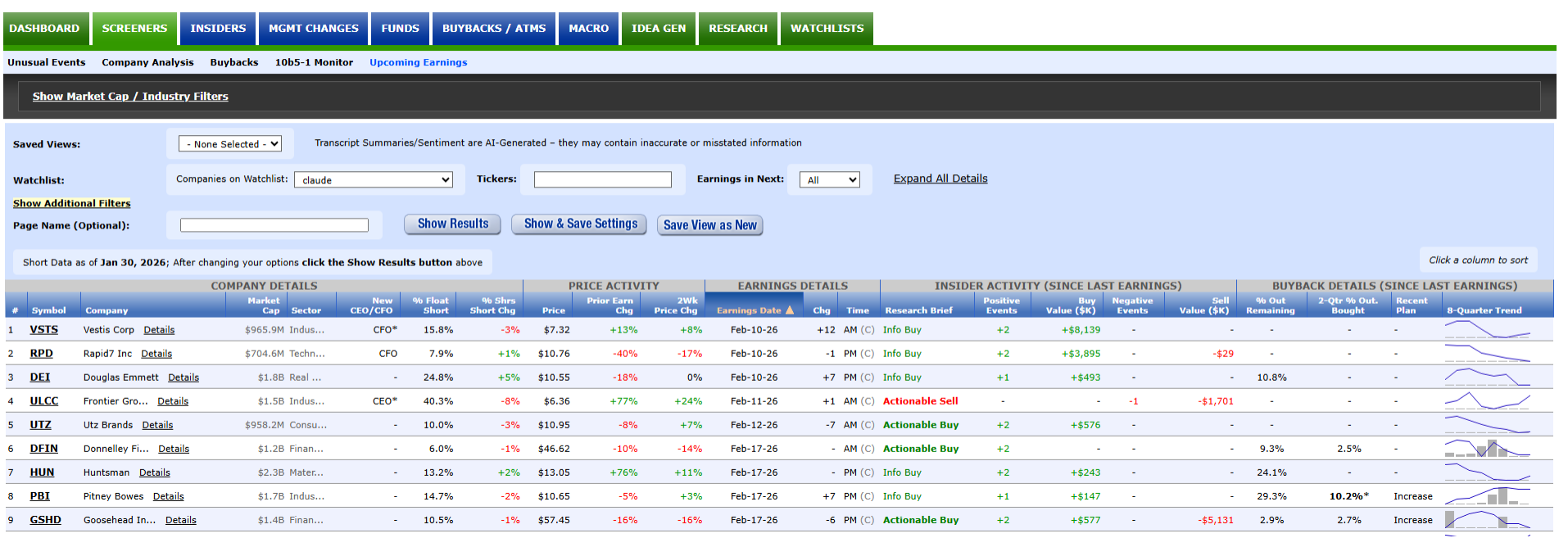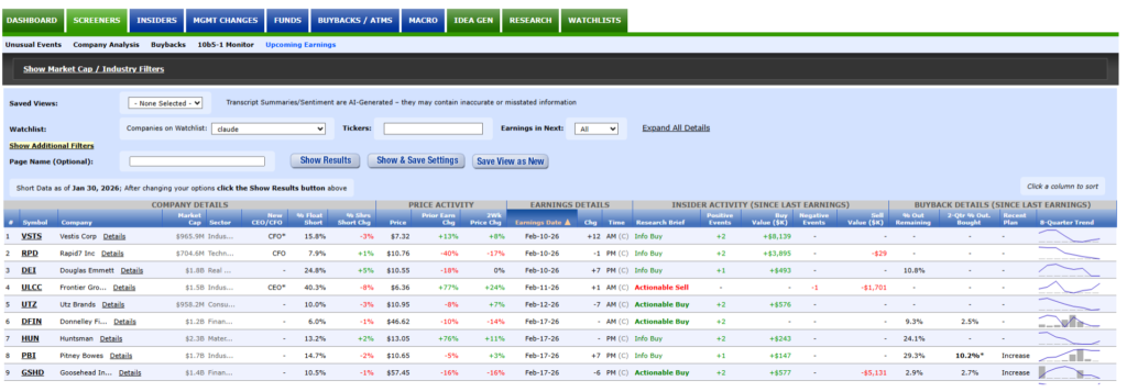 The new Earnings Screener combines earnings calendar data from Wall Street Horizon with VerityData | InsiderScore data across insider activity, buyback behavior, short interest, and event scoring. Wall Street Horizon is a primary source of forward-looking earnings date intelligence, covering confirmed and estimated dates across global equities.
