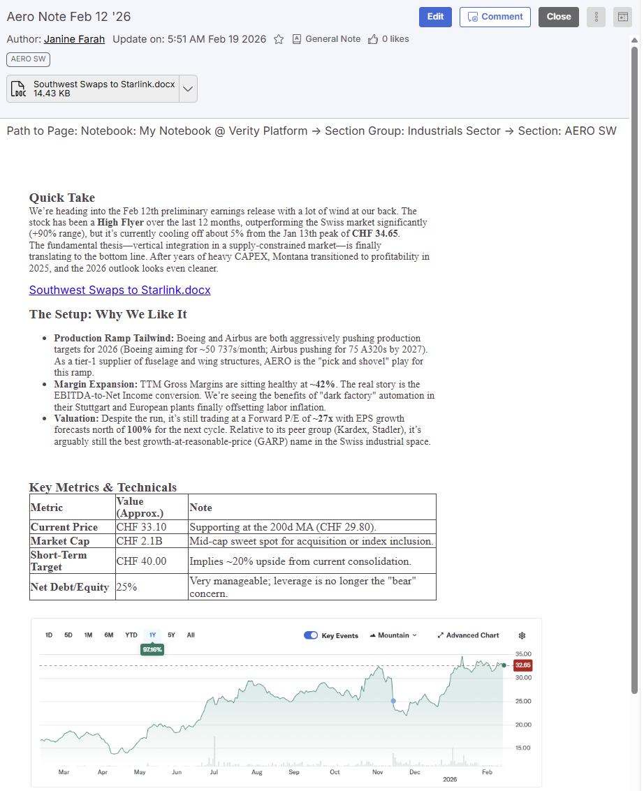 Earnings season concentrates large volumes of information into a narrow window where speed and consistency matter. VerityRMS earnings workflows support this pace with structured note templates, integrated market data, and dashboards built to track expectations versus actual results across coverage.