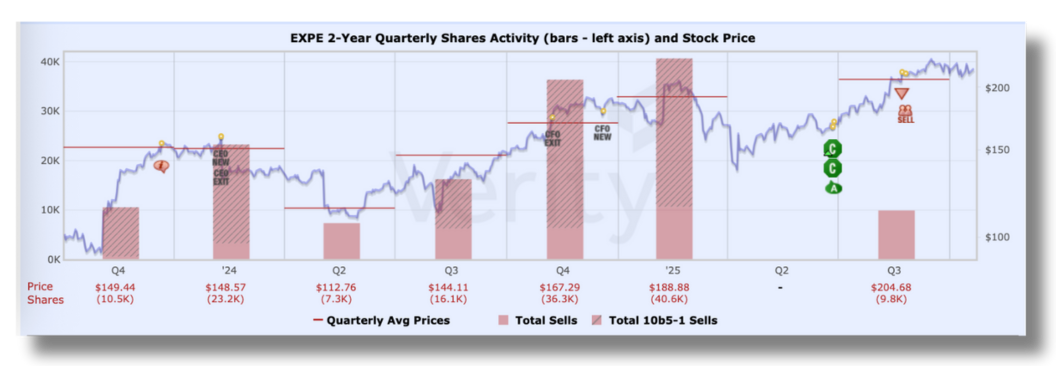 Expedia showed a different but equally clear pattern. The company experienced continuous insider selling for five years, from Q2 2020 through Q1 2025. When the stock fell below roughly $150, both automated and discretionary sales paused.