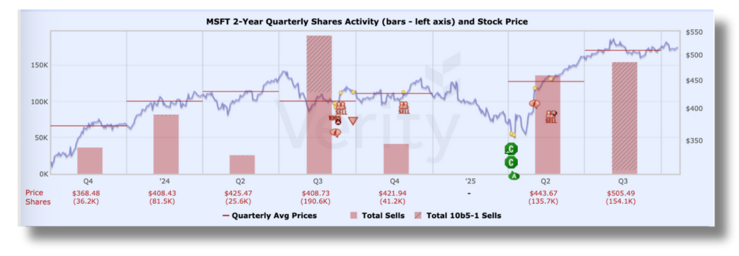 After years of consistent insider sales (every quarter since 2012), MSFT insiders paused in early April 2025 — shown by the Green “C” Cessation of Selling marker.